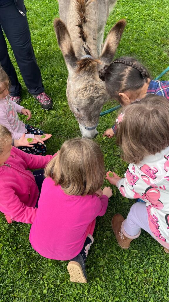 Erlebt gemeinsam mit der Kindergartengruppe einen unvergesslichen Tag auf unserem Bauernhof! In liebevoll begleiteten tiergestützten Angeboten begegnen die Kinder unseren Tieren mit Ruhe, Neugier und ganz viel Freude. Ob Esel, Alpakas, Kaninchen oder Hühner – jede Begegnung bietet neue Erfahrungen für Kopf, Herz und Hand. Im Vordergrund stehen dabei das Vertauen, die Beziehung zum Tier und das gemeinsame Erleben in der Gruppe! Unsere Angebote sind so individuell wie ihr, wie gehen immer gerne auf eure Wünsche ein. Sprecht uns dazu gerne an!