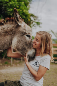Ich bekam die Möglichkeit auf einen großen Eselgnadenhof zu arbeiten und gleichzeitig mit diesen wundervollen Tieren Kindern mit Beeinträchtigung zu helfen.
